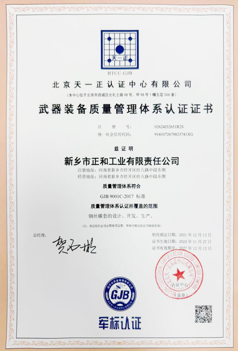 公司于2008年8月29日取得了中國(guó)新時(shí)代認(rèn)證中心軍工產(chǎn)品GJB9001B-2009質(zhì)量管理體系認(rèn)證證書,并繼續(xù)保持。
